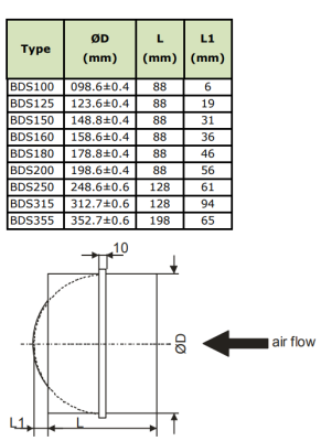 Корпус обратного клапана BDS изготовлен из оцинкованной стали. Лопасти заслонки изготовлены из алюминия, вал и пружина изготовлены из нержавеющей стали. Герметичность заслонки обеспечивает возвратная пружина, которая закрывает лопасти заслонки и, тем самым, снижает уровень шума.