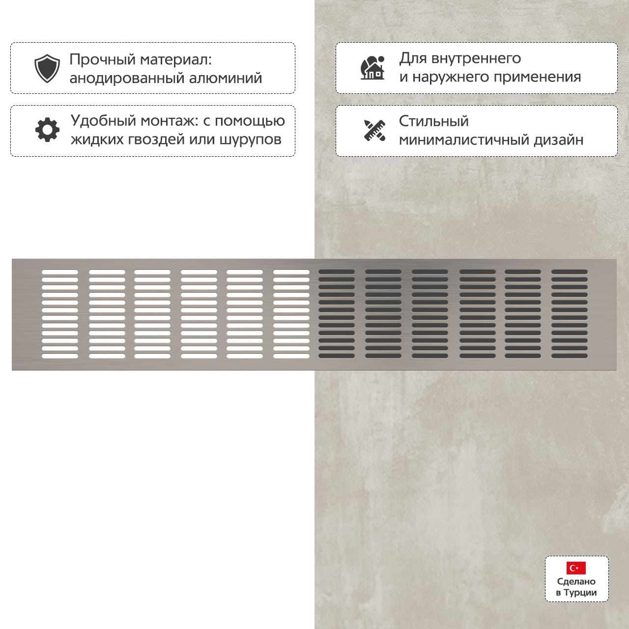 Прямоугольная вентиляционная решетка изготовлена из анодированного алюминия.