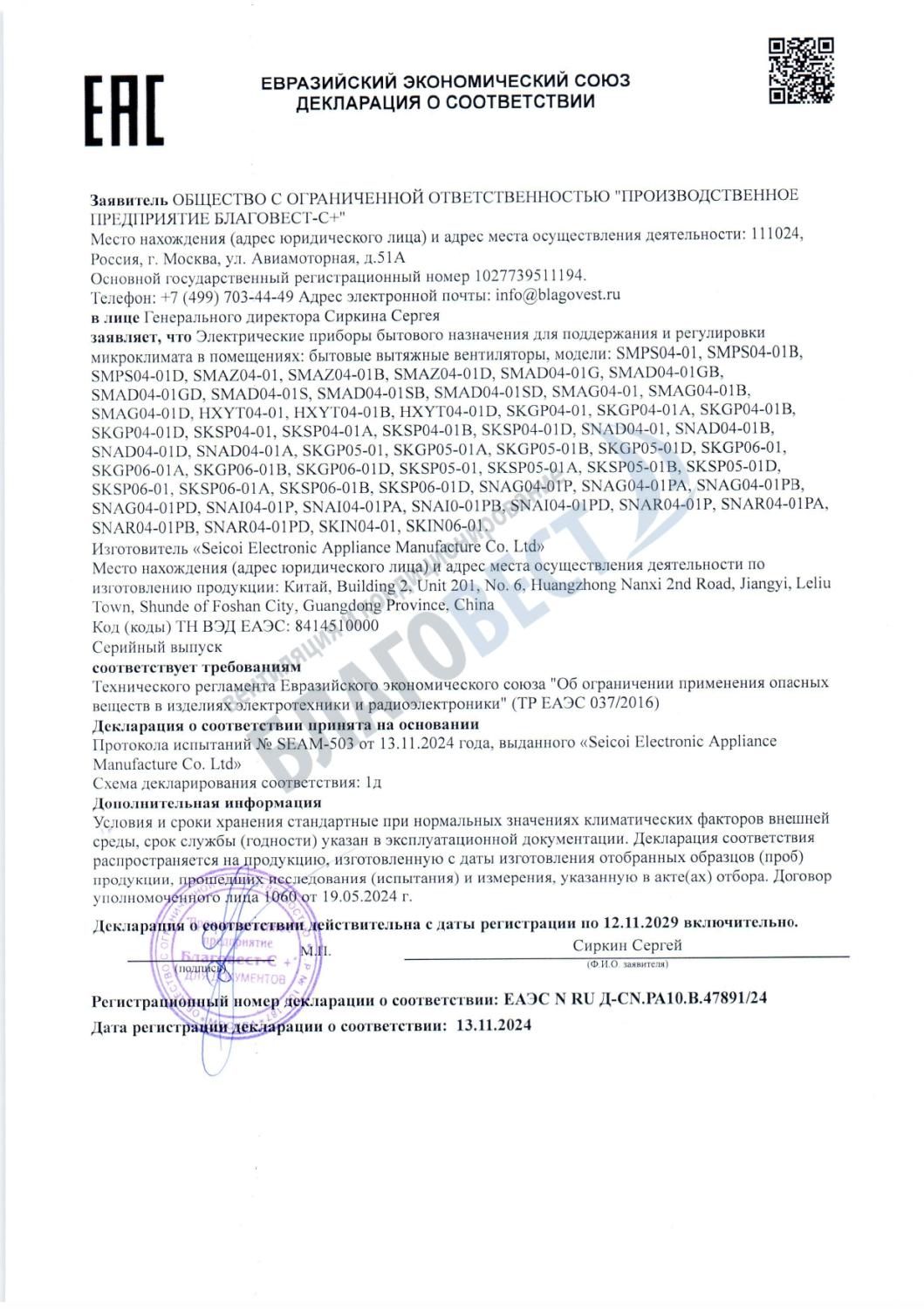 Декларация о соответствии вытяжные вентиляторы Seicoi